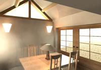 3D render of the interior of the extension showing a dining room layout and lighting options. Oh yes ! the software can demonstrate lighting effects |